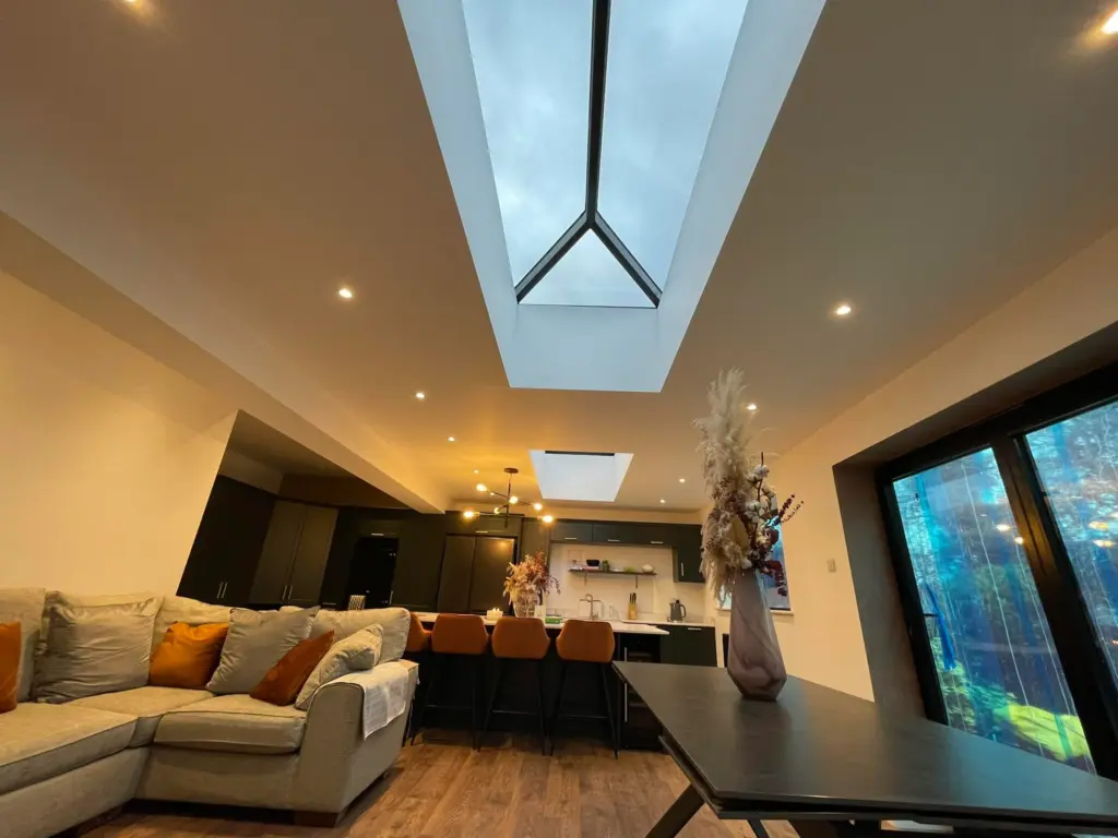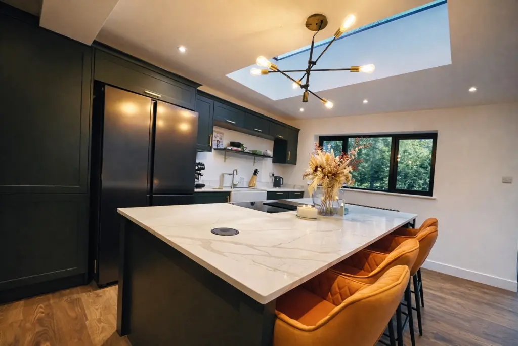 This renovation project transformed both levels of the property. Downstairs, we carried out a full renovation, installing new windows throughout, a secure front door, and upgraded flat roofing. A modern kitchen was designed, supplied, and installed, tailored to the client’s needs.