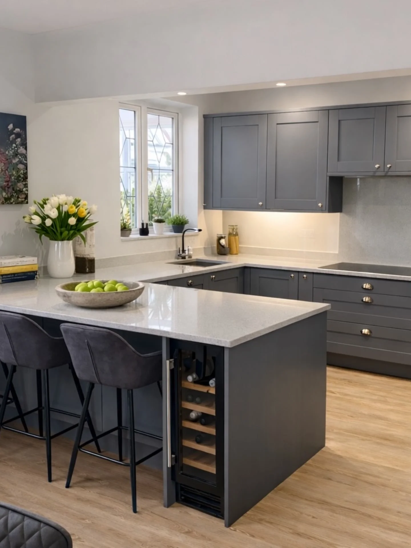 This project involved a full renovation of the downstairs area, including new windows throughout, a secure front door, upgraded flat roofing, and the design, supply, and installation of a modern kitchen. Our standout achievement was creating a bespoke media wall, seamlessly combining storage, lighting, and integrated audio-visual features to become the focal point of the living space.